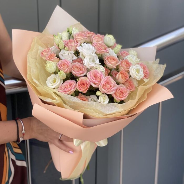 кустовая роза азора – 5 шт. эустома белая – 4 шт. Оформление – 1 шт. Писташ – 2 шт.