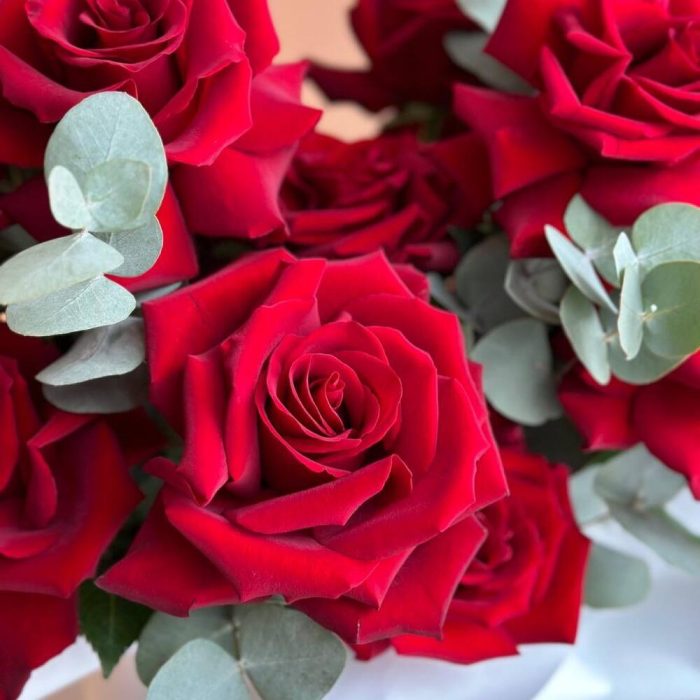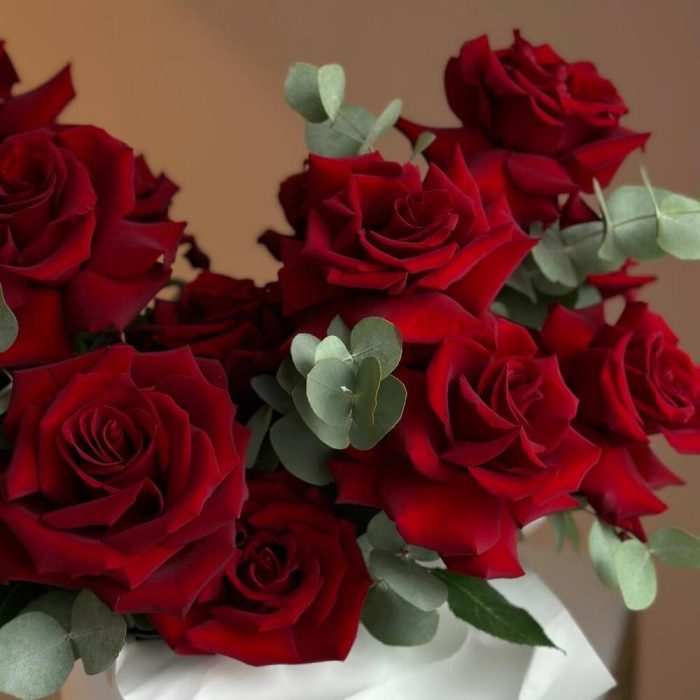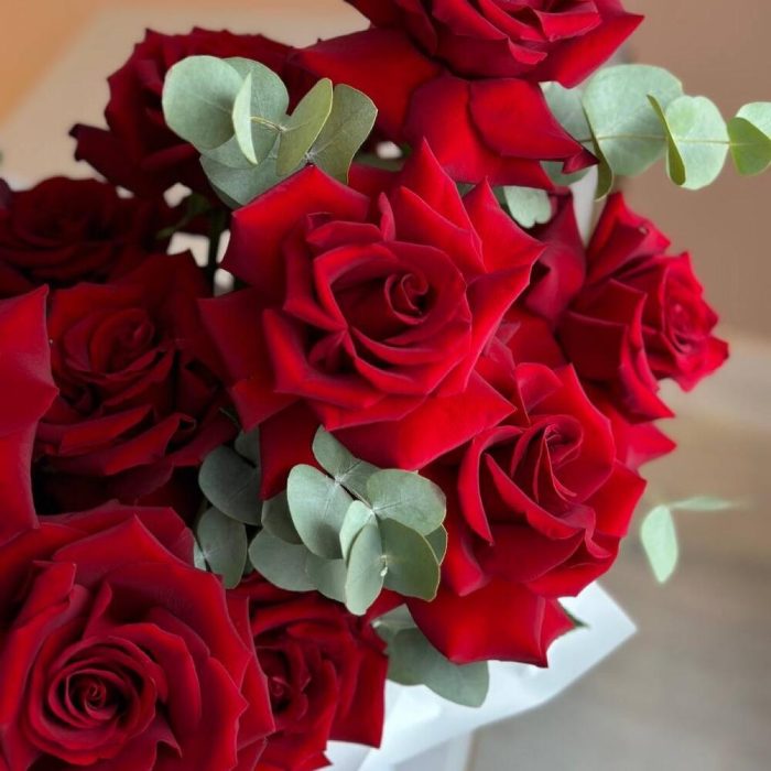 Вывернутые бархатные алые розы в белоснежной упаковке
