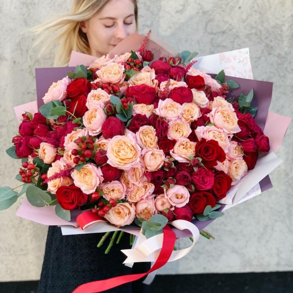 джульетта кустовая пионовидная – 13 шт.кустовые красные роза – 13 шт.Роза красная одноголовая – 9 шт.Гиперикум – 6 шт.Астильба – 5 шт.Эвкалипт – 3 шт.Кризал – 1 шт.Аквапак – 1 шт.транспортировочный бокс – 1 шт.