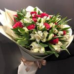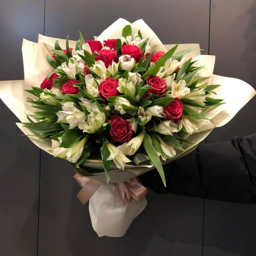Альстромерия белая – 15 шт.роза красная кения 40 см – 15 шт.Упаковка дизайнерская – 1 шт.Лента атласная – 1 шт.