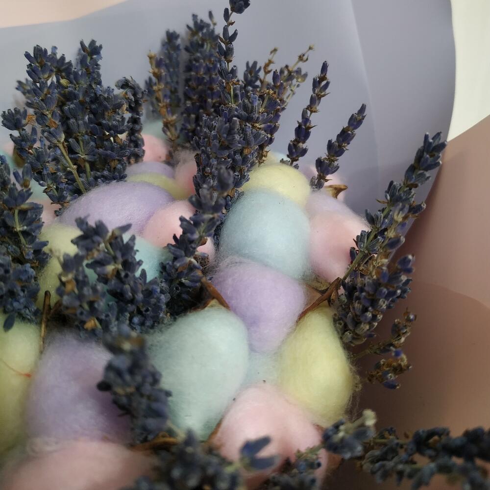 «Лавандовое созвездие» Букет из розы, гвоздики, статица и хлопка