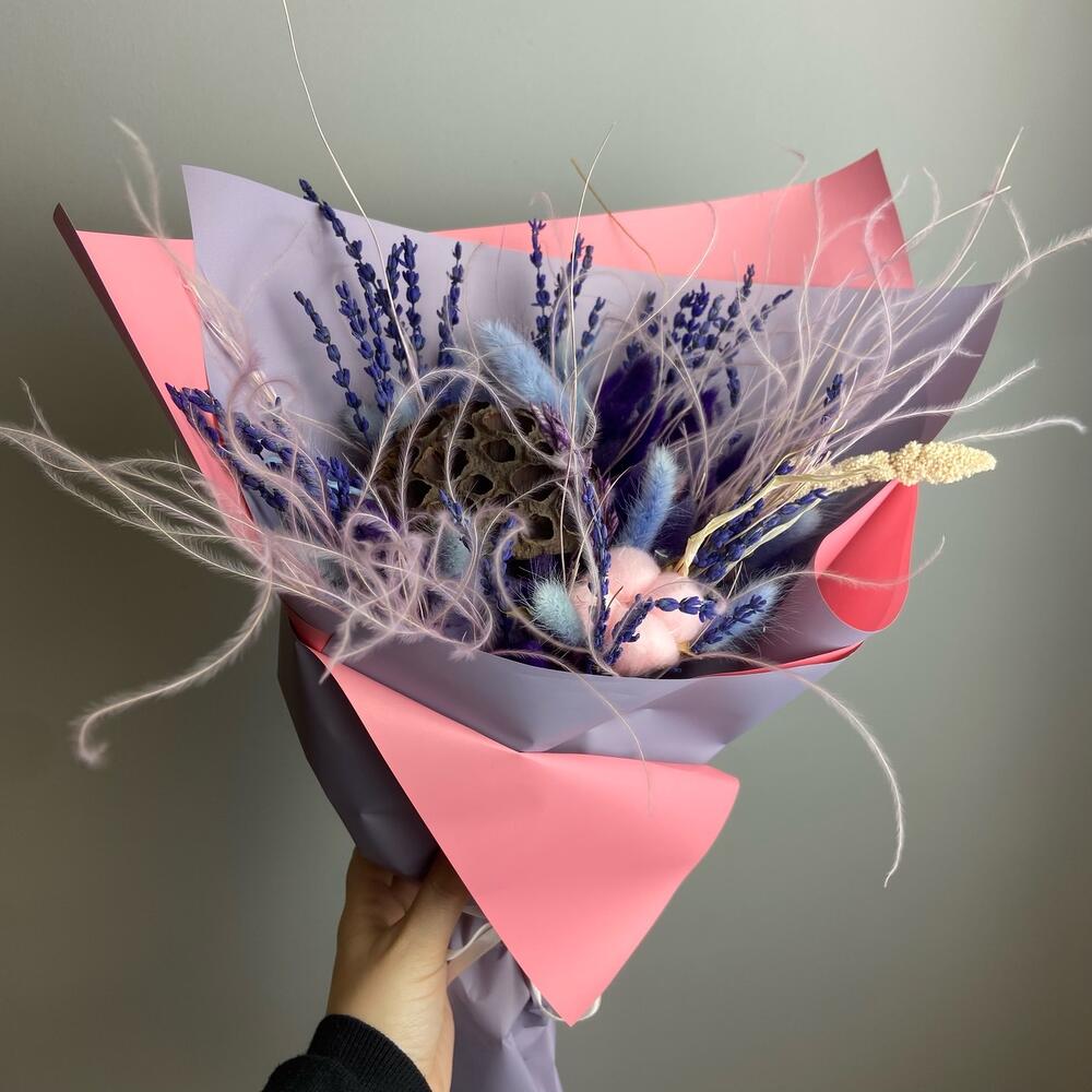Хлопок – 7 шт.лагурус (сухоцвет) пучок – 2 шт.Лаванда (сухоцвет) пучок – 2 шт.ковыль пучок – 1 шт.Лотос сухой – 1 шт.Декор – 3 шт.Упаковка дизайнерская – 1 шт.