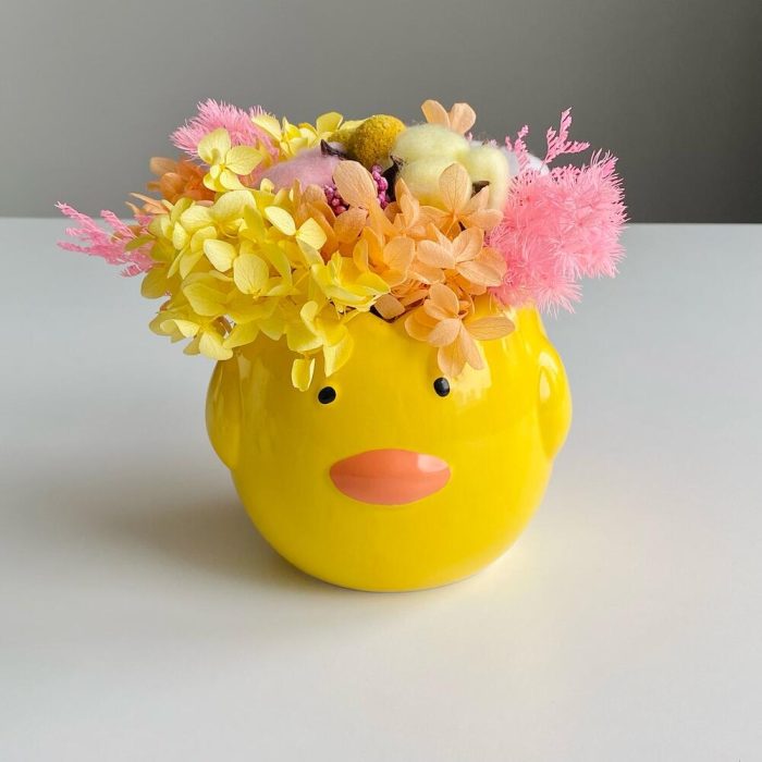 Милый керамический малыш с сухоцветами и стабилизированными цветочками.Цветы не завянут, будут радовать несколько лет.Уход:- водой не поливать- на солнышко и подоконник не ставить