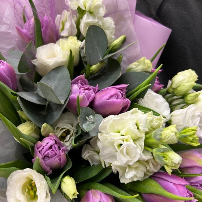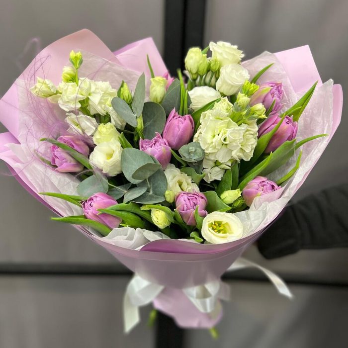Тюльпан пионовидный – 9 шт.Маттиола – 2 шт.эустома розита вайт – 1 шт.Эвкалипт – 3 шт.Тишью – 2 шт.Пленка матовая – 2 шт.Ковыль – 1 шт.