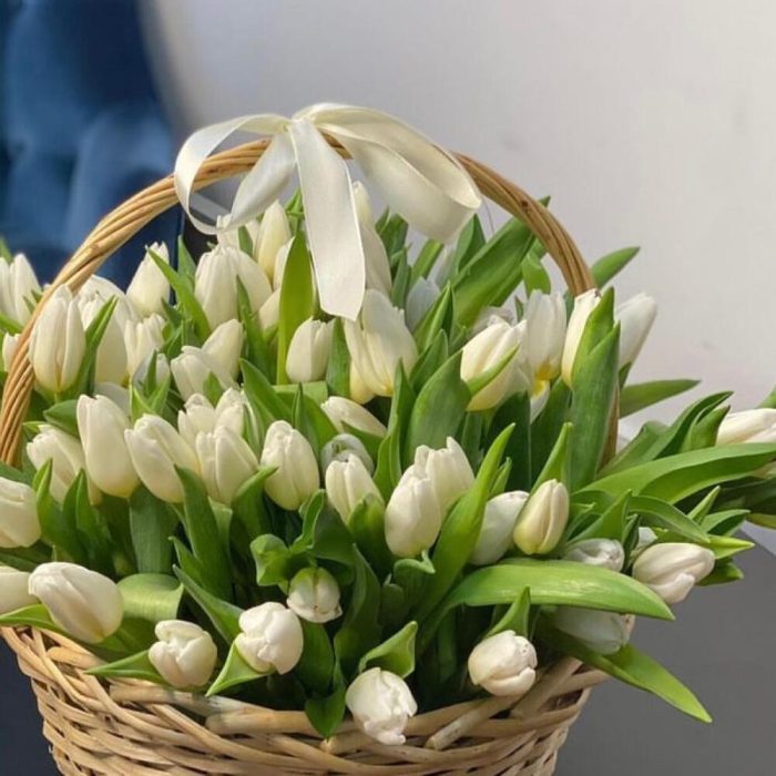 тюльпаны белые – 51 шт.Корзина плетеная – 1 шт.Лента атласная – 1 шт.Открытка – 1 шт.хорошее настроение – 100 шт.инструкция по уходу за цветами – 1 шт.Кризал – 1 шт.