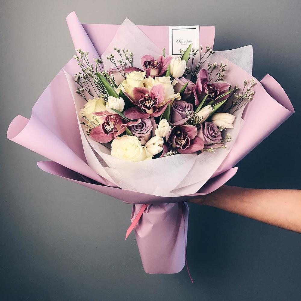 Лимониум – 2 шт.Фисташка – 3 шт.Орхидеи – 5 шт.тюльпаны – 6 шт.розы сиреневые – 5 шт.розы белые – 4 шт.